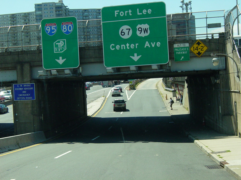 The ramp for exit 73-74 when coming from the lower level of the George Washington Bridge merges into Bridge Plaza North. The roadway then splits. Bear right for Fletcher Avenue (US 9W) north and the Palisades Parkway (NJ 445). Continue straight ahead for NJ 4 west. Bear left to get back on the turnpike south.