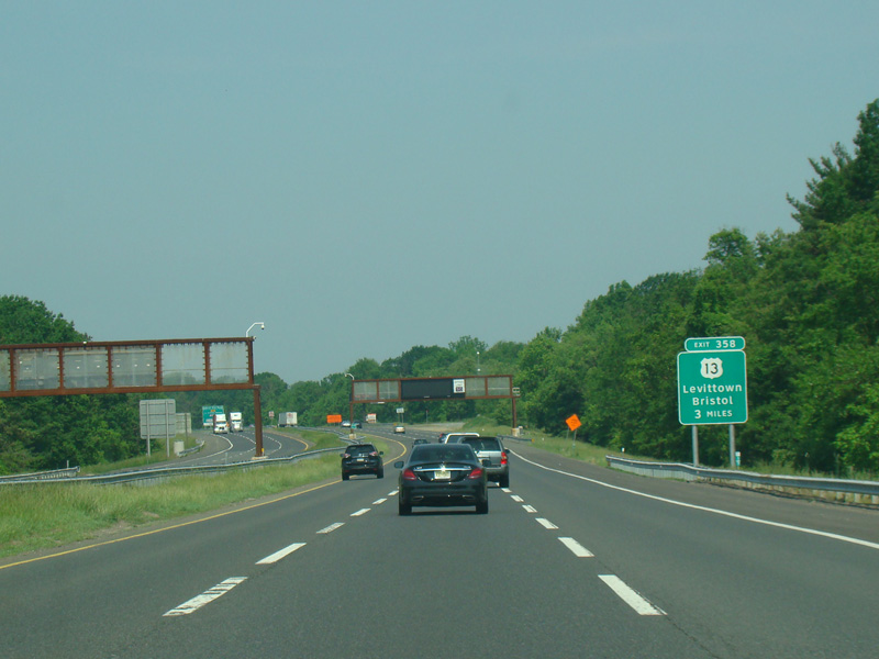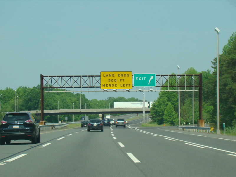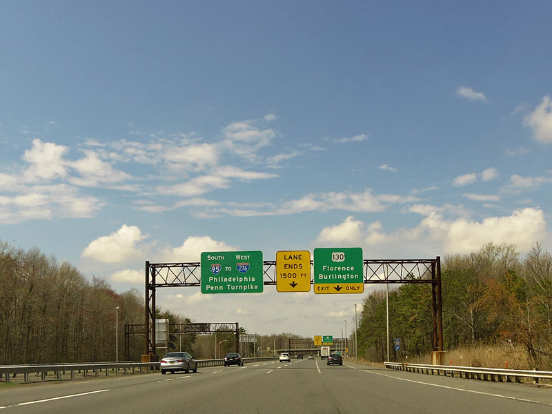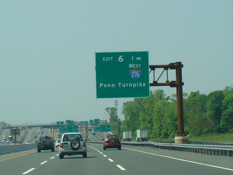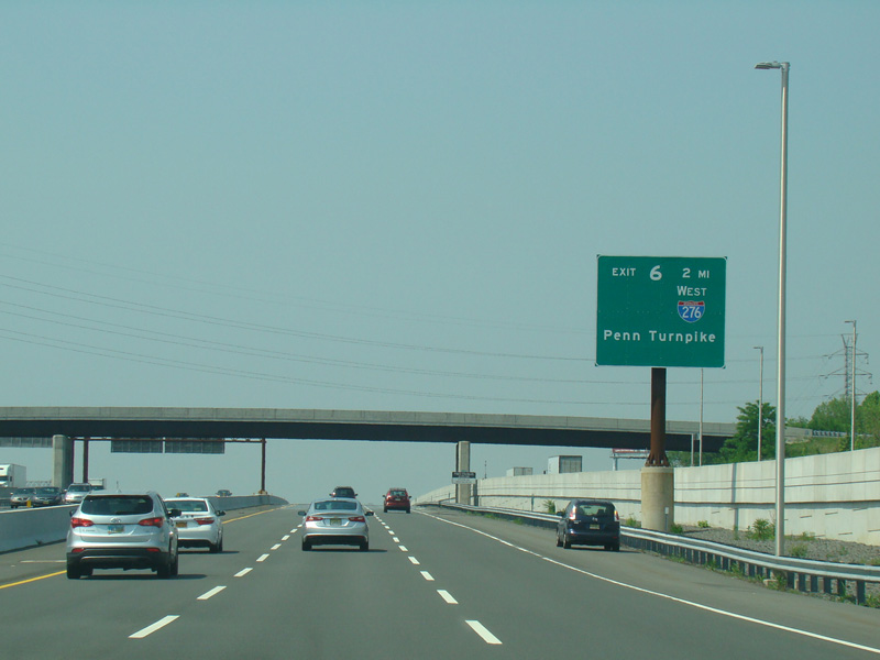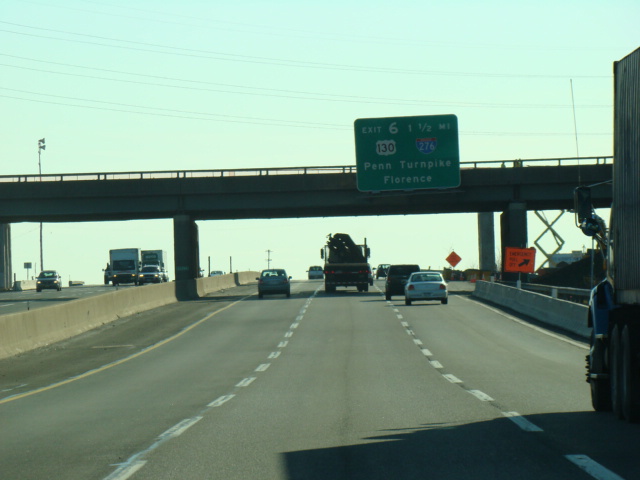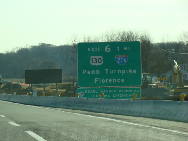 These signs were found on the turnpike extension at exit 6 before the completion of the interchange between the Delaware Expressway (I-95) and the Pennsylvania Turnpike (I-276) in Pennsylvania. The new signs contain I-95 and I-276 shields, as well as an exit only tab for US 130. Exit 358 of I-276 has been renumbered as exit 42 of I-95. There have also been express E-ZPass lanes added to the toll plaza in the years since.
