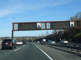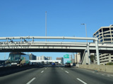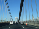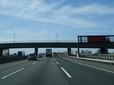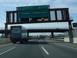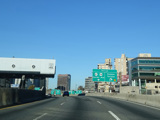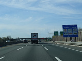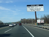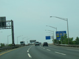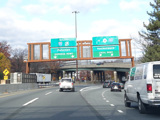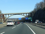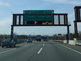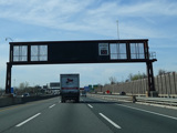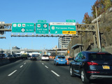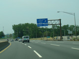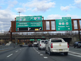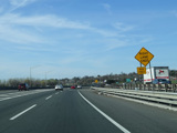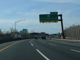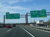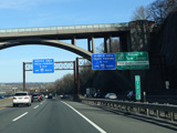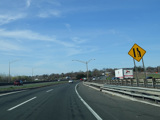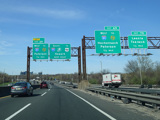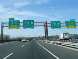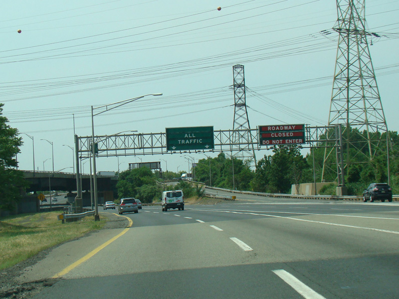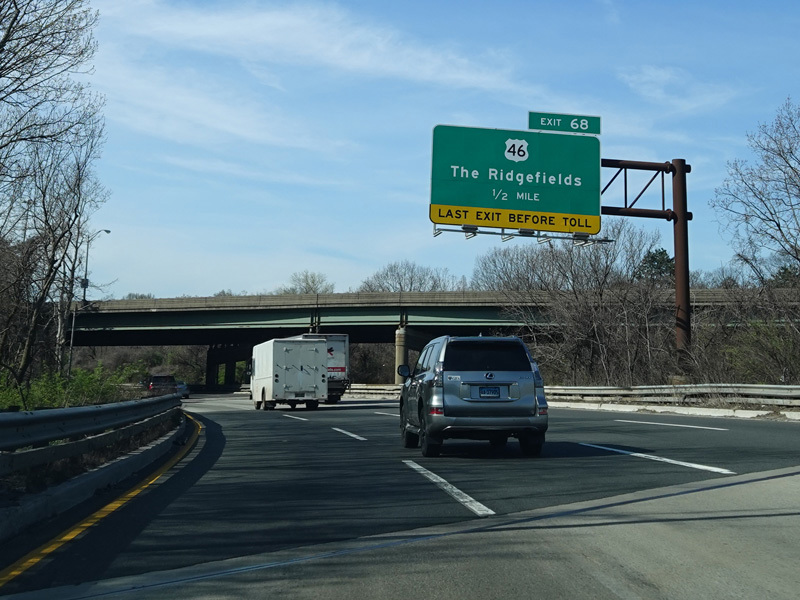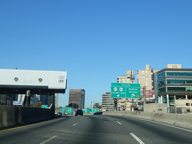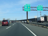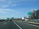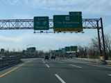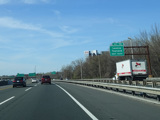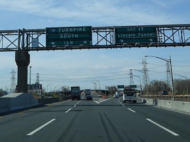 Welcome to New Jersey! I-95 is known as the New Jersey Turnpike beginning here. The exit numbers at its northern end are a continuation of the exit numbering scheme for the Bergen-Passaic Expressway (I-80), which begins a short distance ahead. Exit 74 is for the Palisades Parkway (NJ 445).