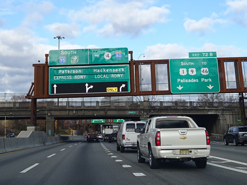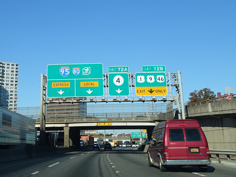 The turnpike splits into two separate roadways, the express roadway and the local roadway. The express roadway provides access to only the most major exits, while the local roadway provides access to all exits. This configuration only exists on the turnpike from here to the beginning of I-80, which also has express and local lanes. Exit 72B is for US 1/US 9/US 46. Exit 72A is for NJ 4 west.