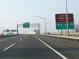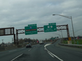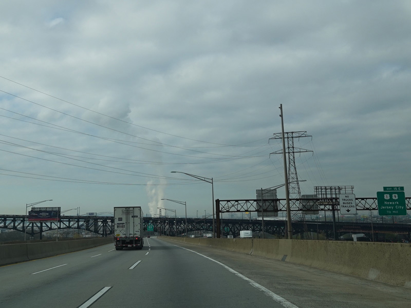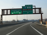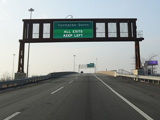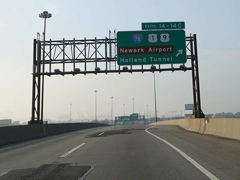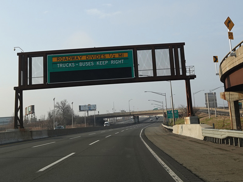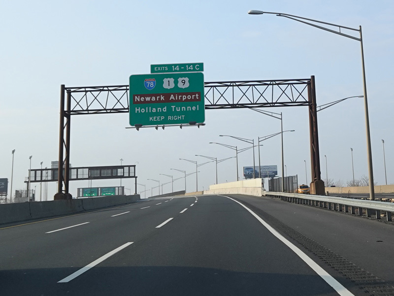 The eastern and western spurs of the turnpike come together here to form a large ten-lane highway. Of the five lanes in each direction, the left three lanes are for cars only and the right two lanes are for all types of vehicles. These are colloquially known as the "car lanes" and "truck lanes," respectively. Exit 14 and exits 14A-C are for I-78, US 1/US 9, and US 22. To access these exits, use the truck lanes.