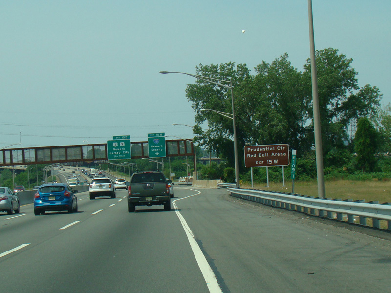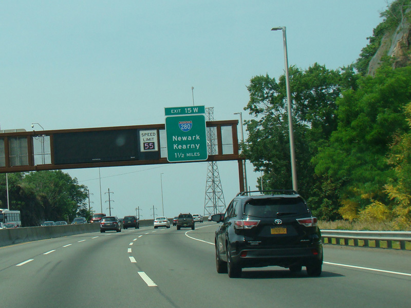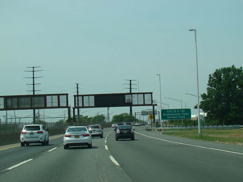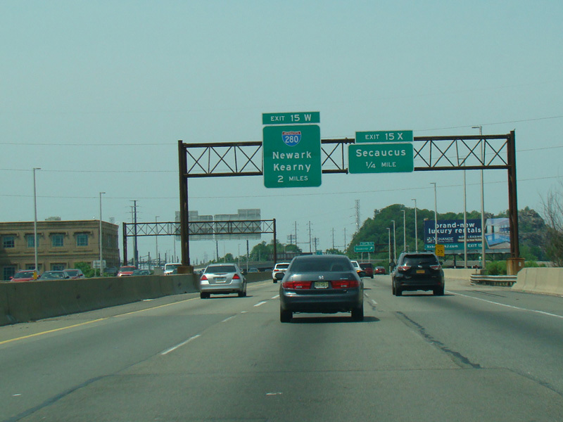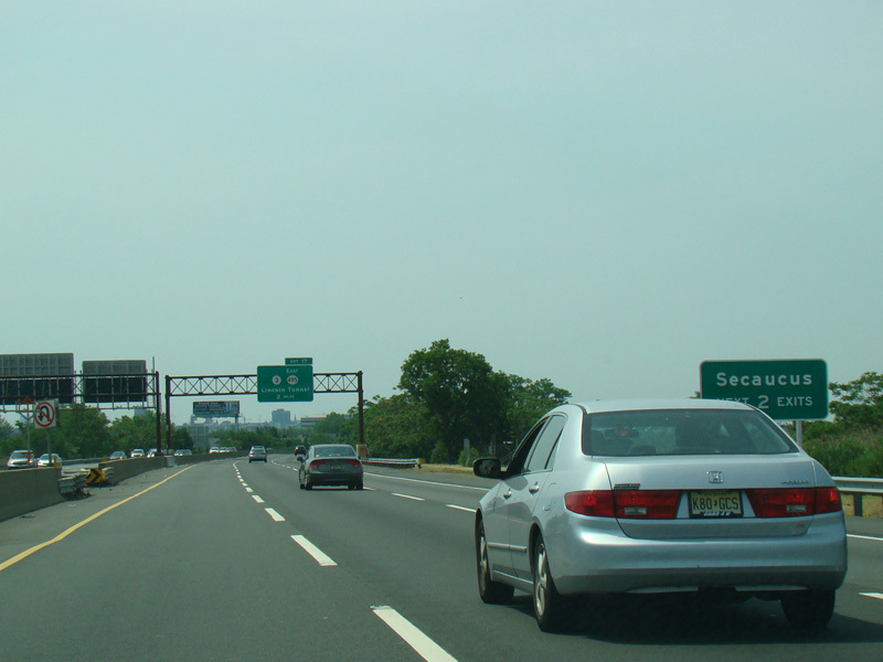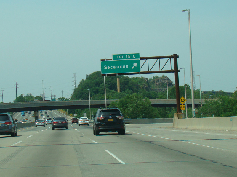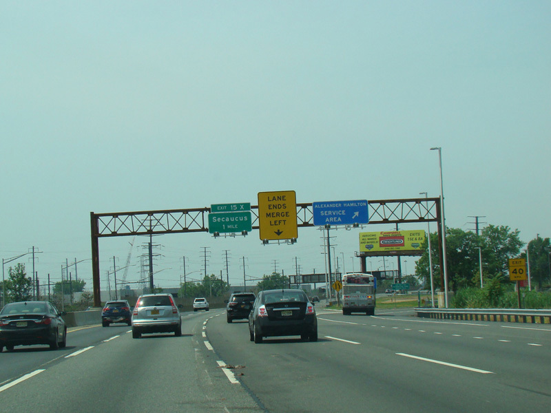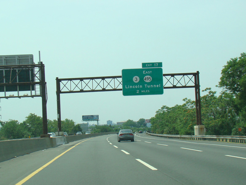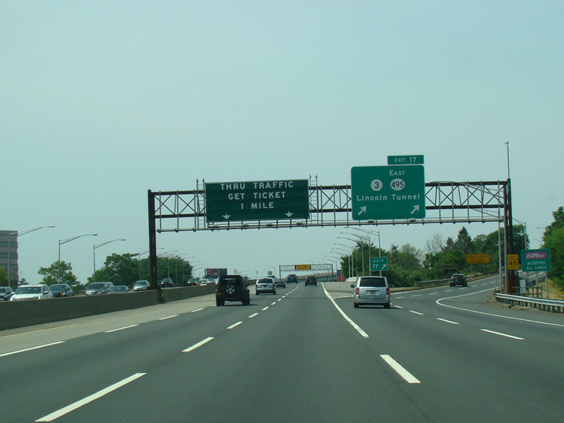 Exit 17 is for the Lincoln Tunnel (NJ 495) and NJ 3. All motorists without E-ZPass who do not exit here must stop at the tollbooth ahead and take a ticket indicating where they got onto the turnpike.
