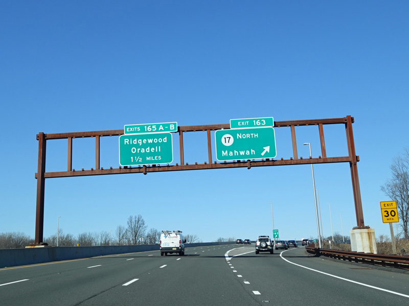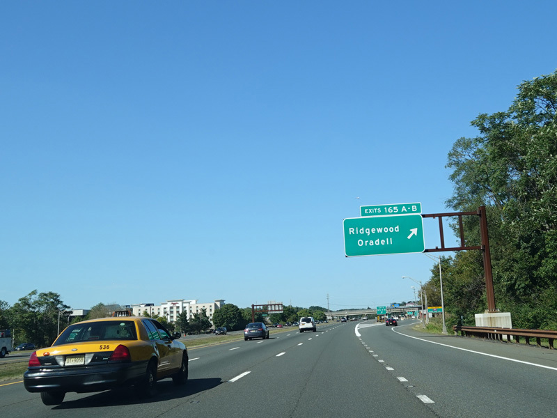 Exits 165A-B are for Ridgewood and Oradell. The exits lead to Oradell Avenue (CR 6) and Ridgewood Avenue (CR 6), but only the town names are posted.