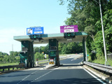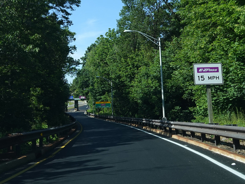 The ramp for exit 154 passes through a tollbooth and then splits. Bear left for US 46 west. Bear right for Grove Street (CR 623).