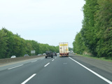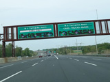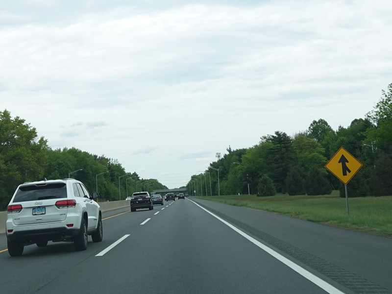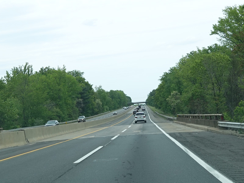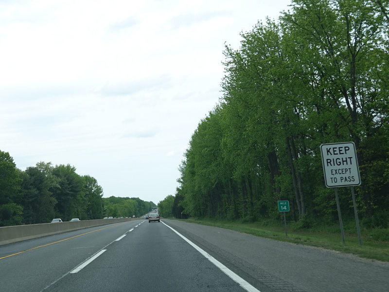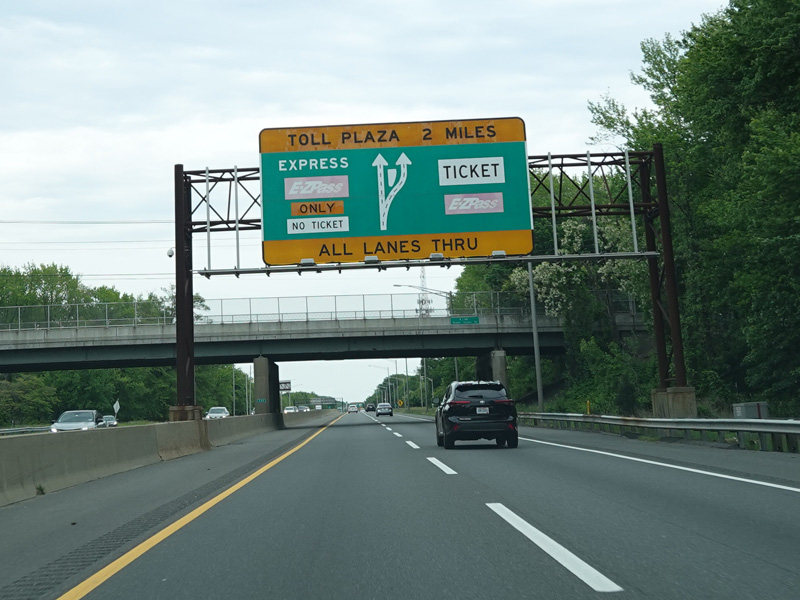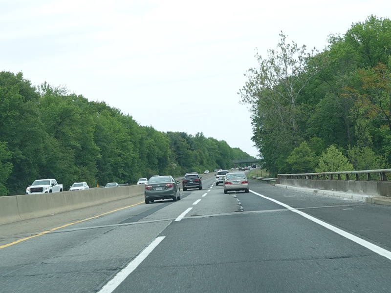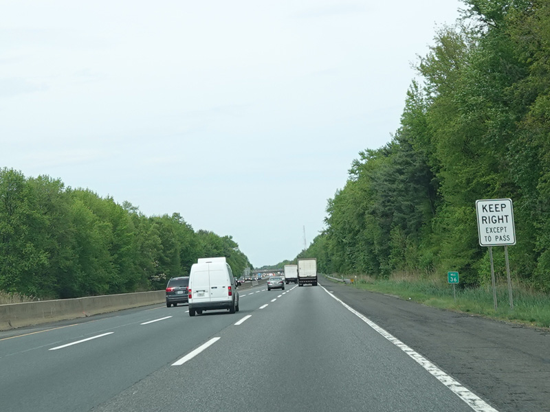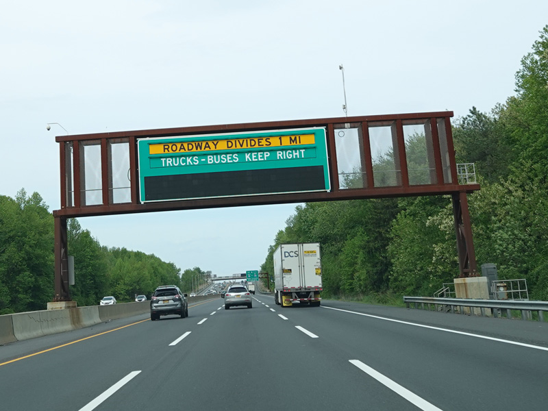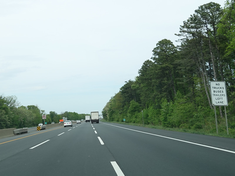 The turnpike divides into two sets of parallel lanes in each direction. Cars may use either set of lanes. Trucks and buses must use the outer lanes.