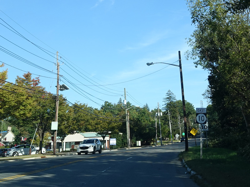 NJ 10 ends here at a traffic light at CR 577. Turn left onto Prospect Avenue to go north, or continue straight ahead on Mount Pleasant Avenue to go south. Turn right onto Prospect Avenue for Spur CR 577, although there is no signage for it here.