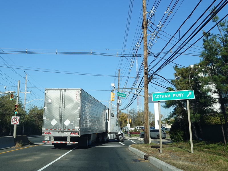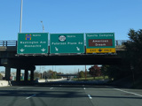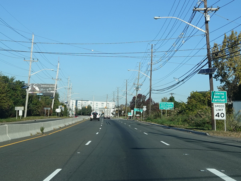The roadway splits. Bear right for the sports complex and American Dream. Bear left to stay on Paterson Plank Road.