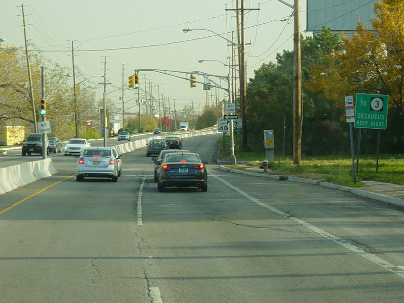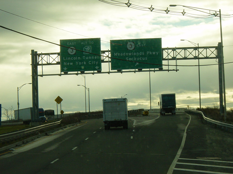 The roadway splits again. Both ramps lead to NJ 3 west. The ramp to the right merges into NJ 3 from the right instead of the left in order to facilitate accessing the exit for Meadowlands Parkway.