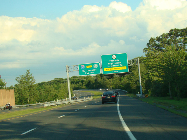 The Hightstown Bypass is a semicircular freeway looping around Hightstown to the north. It begins at Hightstown Road (CR 571) and runs east. There are interchanges at US 130 and NJ 33. It ends at exit 8 of the New Jersey Turnpike (I-95).