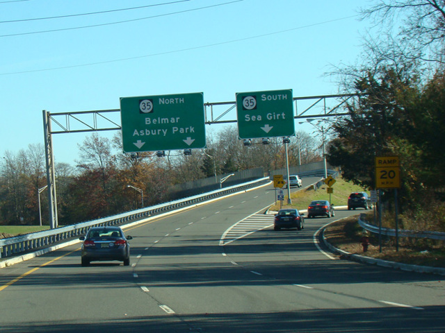 NJ 138 is an extension of I-195 a few miles to the east. I-195 becomes NJ 138 at its interchange with NJ 34. There is one last freeway interchange with the Garden State Parkway (NJ 444), which is assigned an exit number as if it were part of I-195. East of the parkway, NJ 138 is a four-lane divided highway with traffic lights and jughandles. Because of the lights, it does not meet interstate standards and therefore cannot be designated as part of I-195. NJ 18 has its southern terminus at NJ 138. NJ 138 ends at a grade-separated interchange with NJ 35 in Wall.