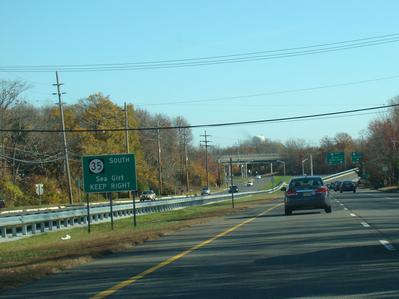 NJ 138 ends at a grade-separated interchange with NJ 35. Bear right to go south or continue straight ahead to go north.