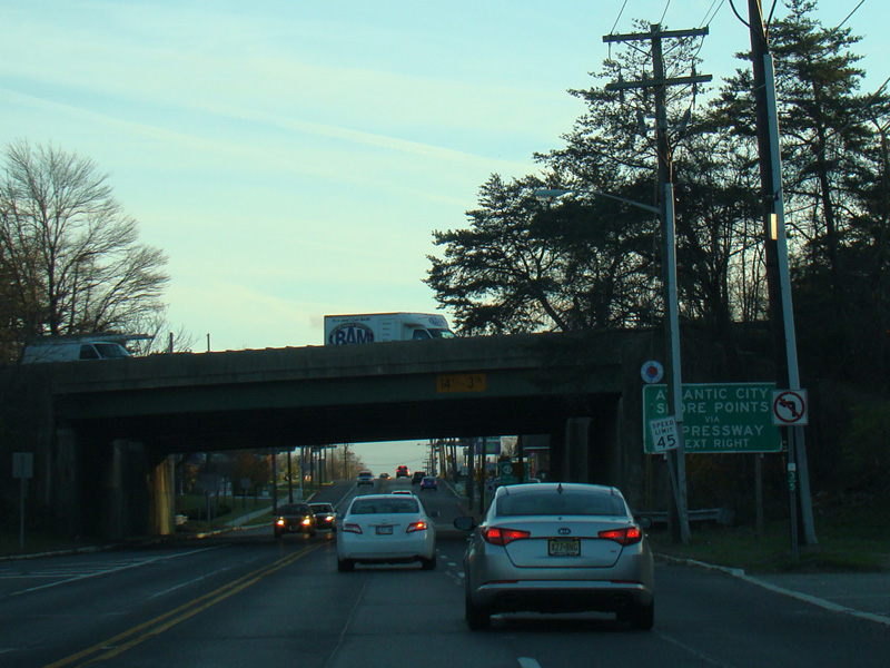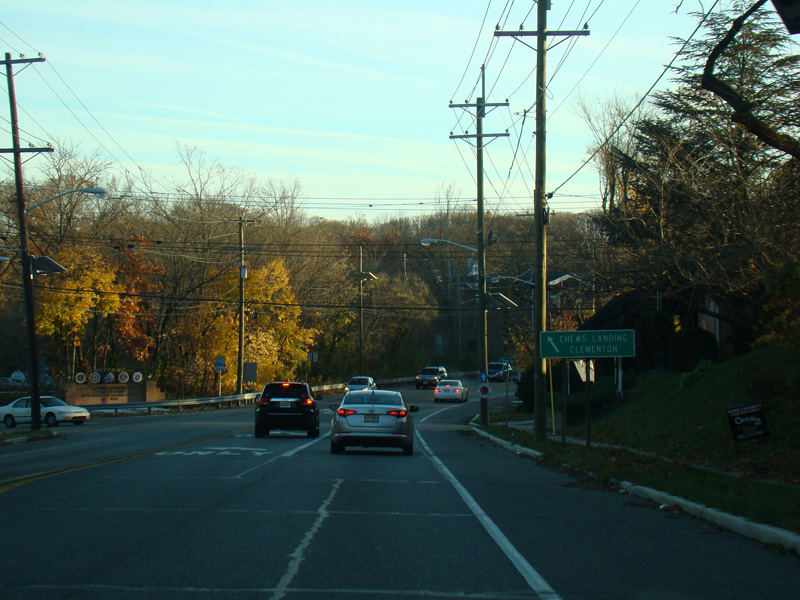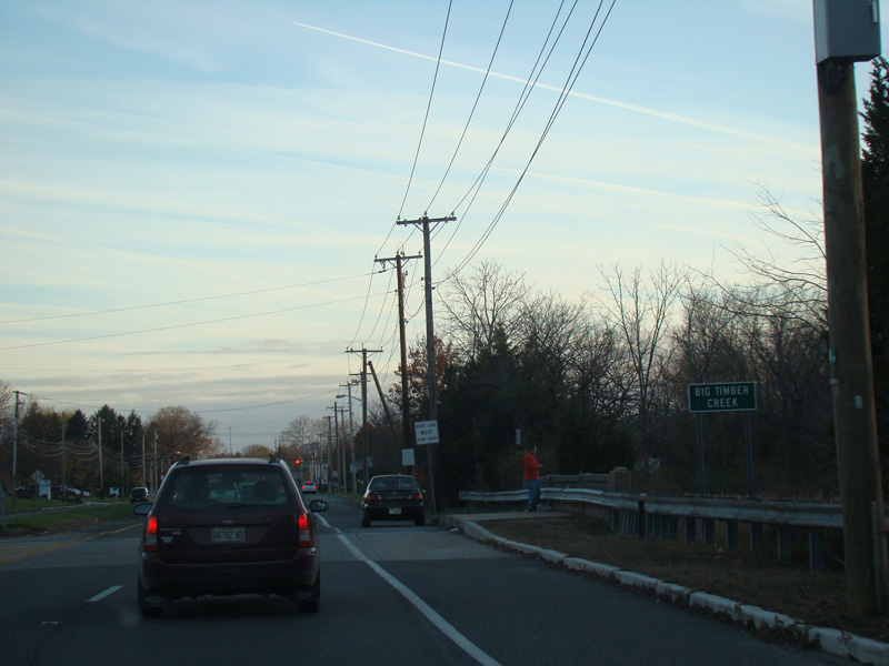 Black Horse Pike widens to become a four-lane divided highway. There is a bridge over Big Timber Creek.