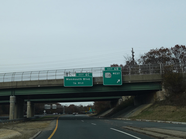 NJ 18 was planned to extend several miles south of where it currently begins to the junction of NJ 34, NJ 35, and NJ 70. Therefore, the exit numbers of the freeway begin at 6. The remaining exit number here reserved for the unbuilt section.