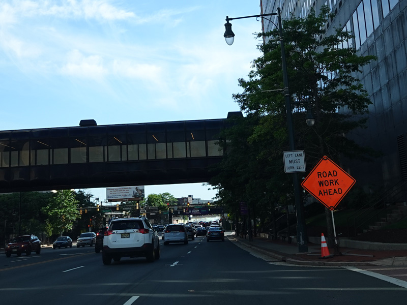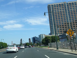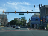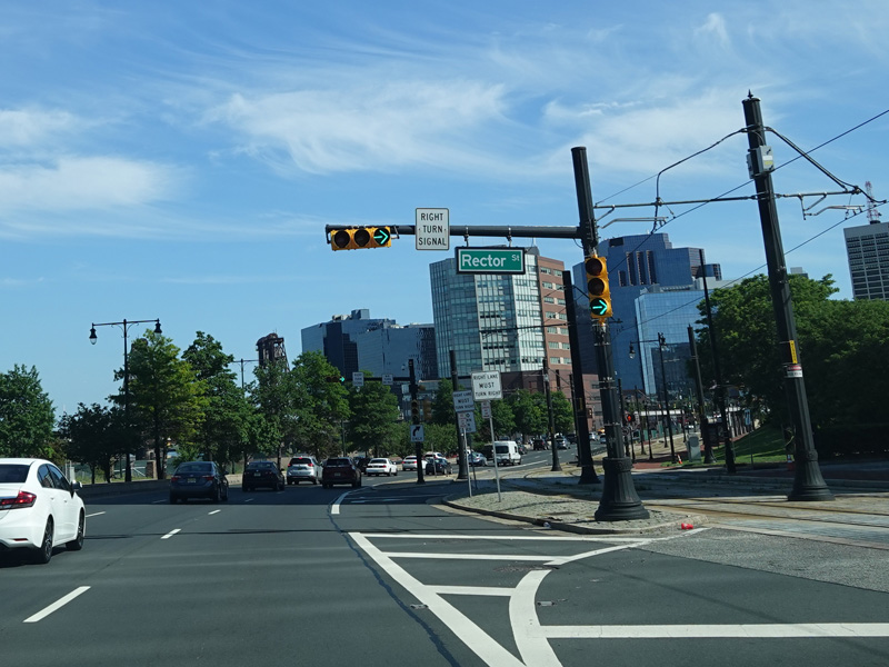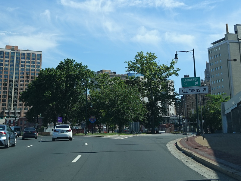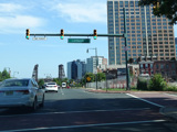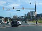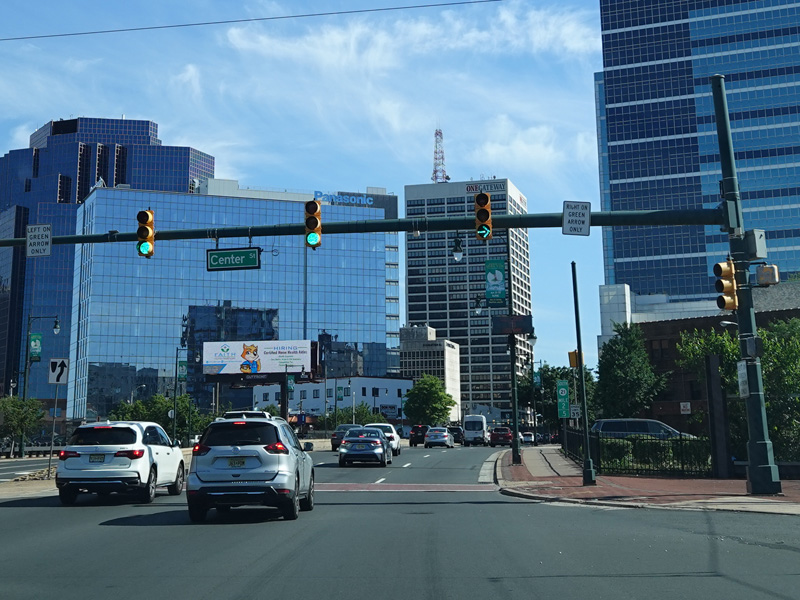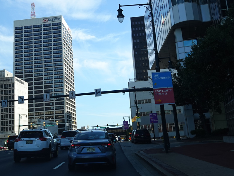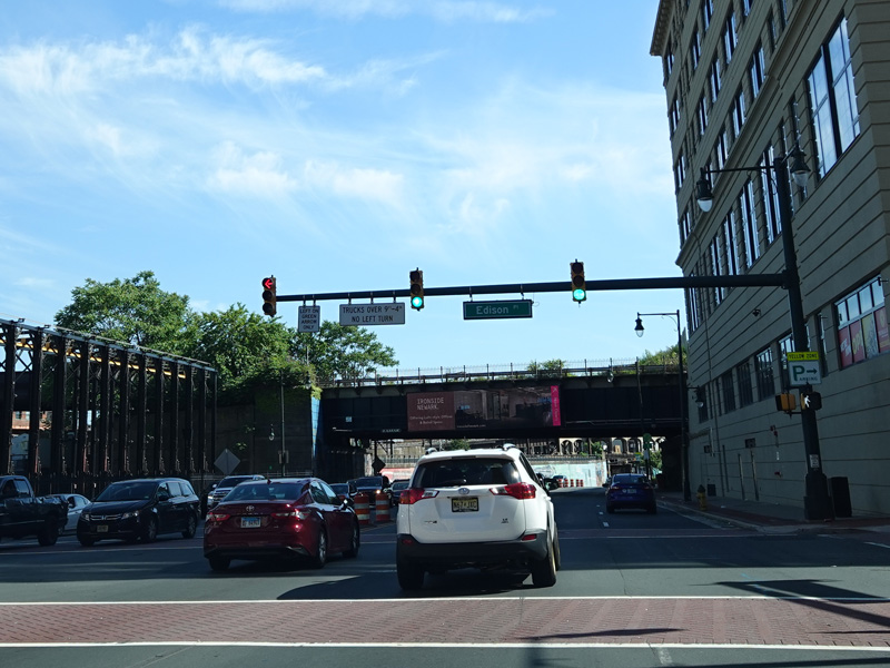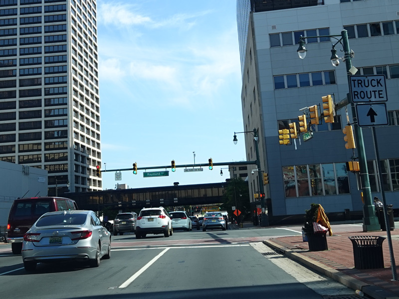 The McCarter Highway becomes a divided boulevard. There are traffic lights at Rector Street, Center Street, Raymond Boulevard, Market Street, Edison Place, and Lafayette Street.