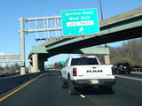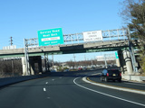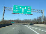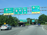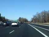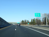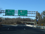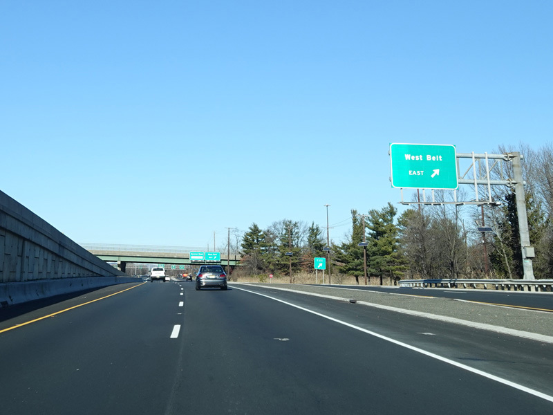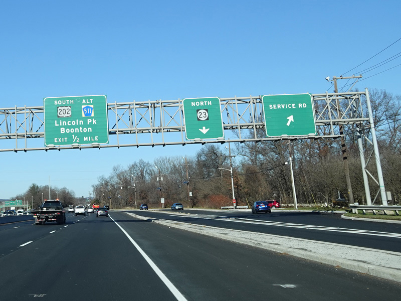 North of the interchange, NJ 23 is a large six-lane divided highway. There is a service road that splits off to the right and has a pair of exits for West Belt.