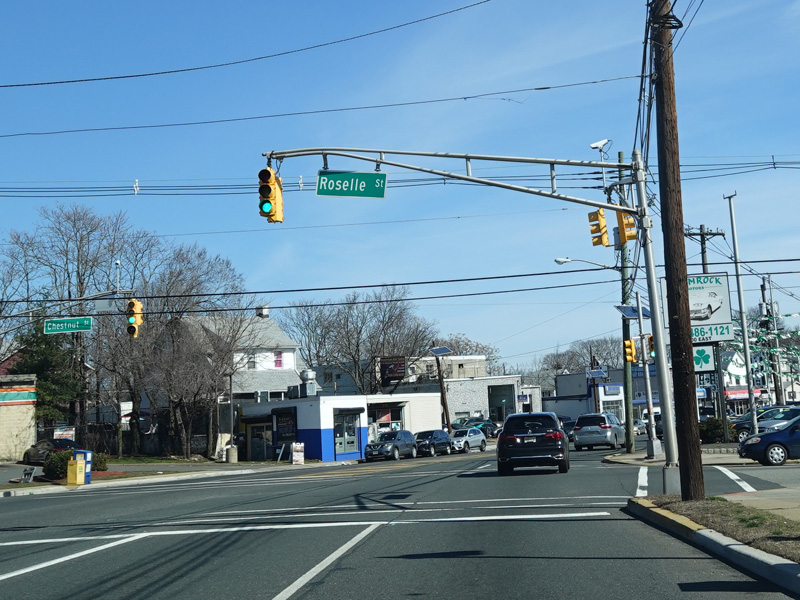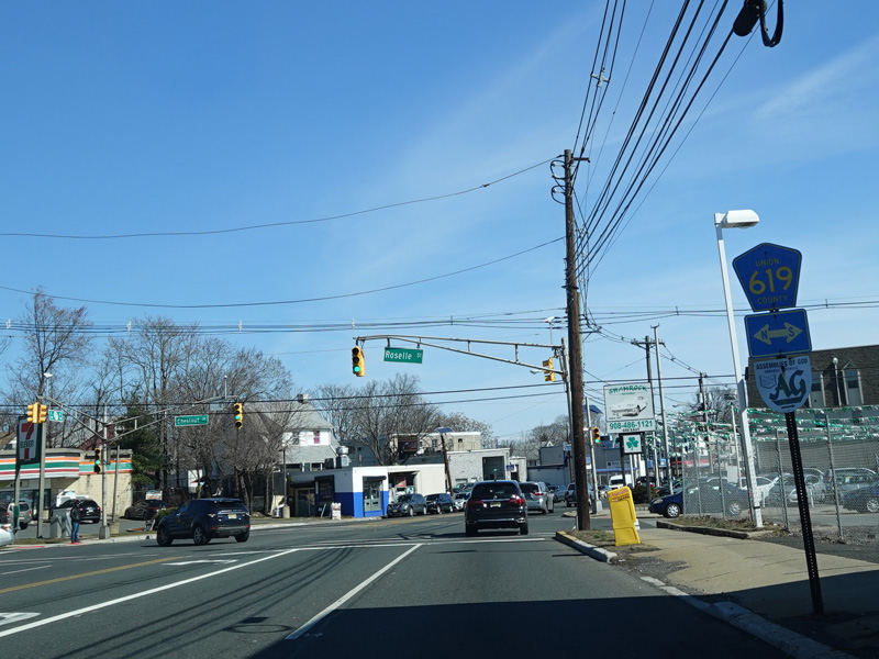 There is a traffic light at CR 619. Turn left onto Chestnut Street to go north or right onto Roselle Street to go south.