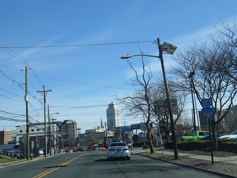 Rahway Avenue continues northeast through Elizabeth. Pearl Street (CR 614) begins on the right.