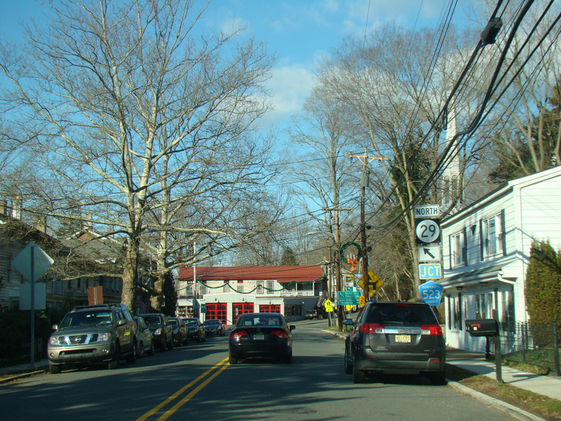 Turn left here for Mount Hope Street. NJ 29 as signed splits off to the left onto Main Street, but Main Street is one-way southbound at this point, so northbound traffic is forced onto NJ 165 straight ahead. The signage here directs northbound traffic to follow NJ 165 for its entire length of about a quarter of a mile and then turn west onto Bridge Street (NJ 179) for one block to rejoin NJ 29 along Main Street.