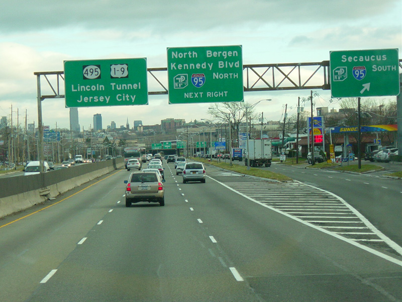 There is an exit for NJ 495 east. NJ 3 ends ahead at Tonnele Avenue (US 1/US 9).