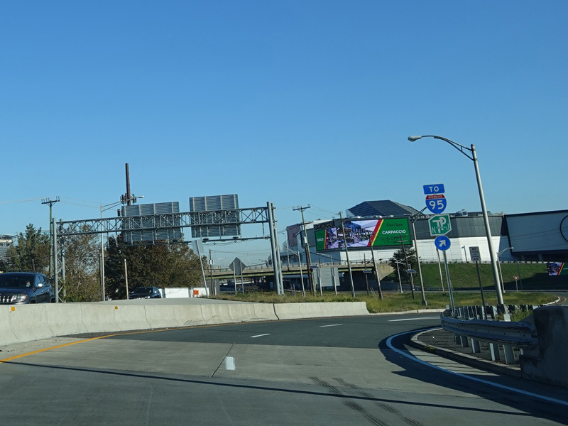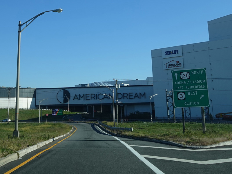 The eastbound ramp for NJ 120 splits twice. Bear right at the first split for the arena and stadium. Bear right at the second split to go west on NJ 3. Continue straight ahead for NJ 120.