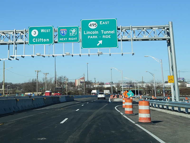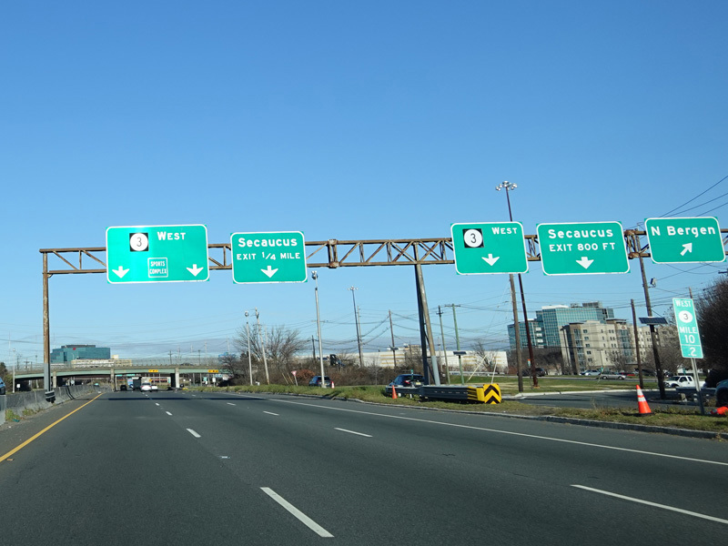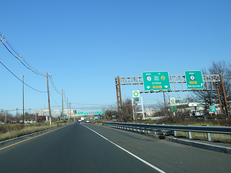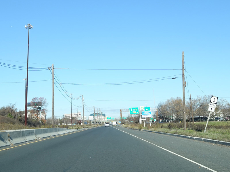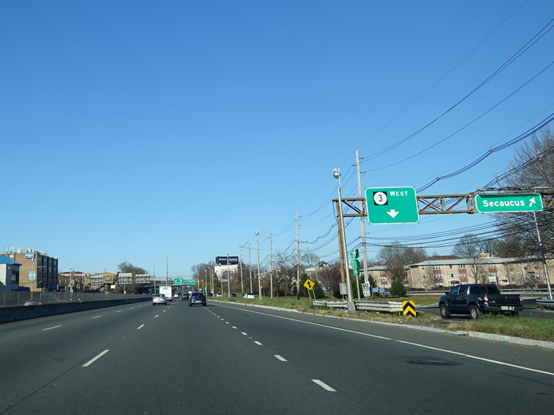 NJ 3 narrows down to a single lane and then widens to three lanes as two lanes from NJ 495 merge in from the right. There is an exit for Secaucus.