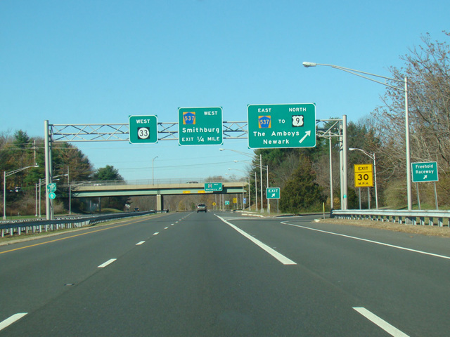NJ 33 is multiplexed with US 130 for several miles to the northeast to East Windsor and then splits off onto Mercer Street, a two-lane road that it follows to Hightstown, where it is multiplexed with CR 539 along Main Street for a couple of blocks to the north and then turns east onto Franklin Street. There is an interchange with the Hightstown Bypass (NJ 133) and the New Jersey Turnpike (I-95). At the interchange, NJ 33 widens to become a four-lane divided highway with jughandles at many of its intersections. In Freehold, NJ 33 becomes a short expressway called the Freehold Bypass for a few miles. In this area, there is a business route along Park Avenue through Freehold. At the end of the Freehold Bypass, NJ 33 and Business NJ 33 merge together to become a two-lane undivided road again. It continues east to Wall, where it is multiplexed with NJ 34 for about half a mile. East of the multiplex, it widens to four lanes again and there are interchanges with the Garden State Parkway (NJ 444) and NJ 18. In this area, it is known as Corlies Avenue. It ends at Main Street (NJ 71) in Neptune.