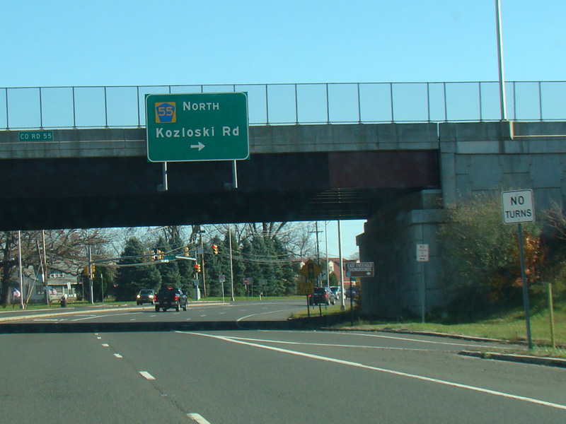 There is a grade-separated interchange at CR 55, which is known as Halls Mill Road to south and Kozloski Road to the north. The northbound ramp is to the right at a traffic light. Turn left at the light for Asbury Avenue.