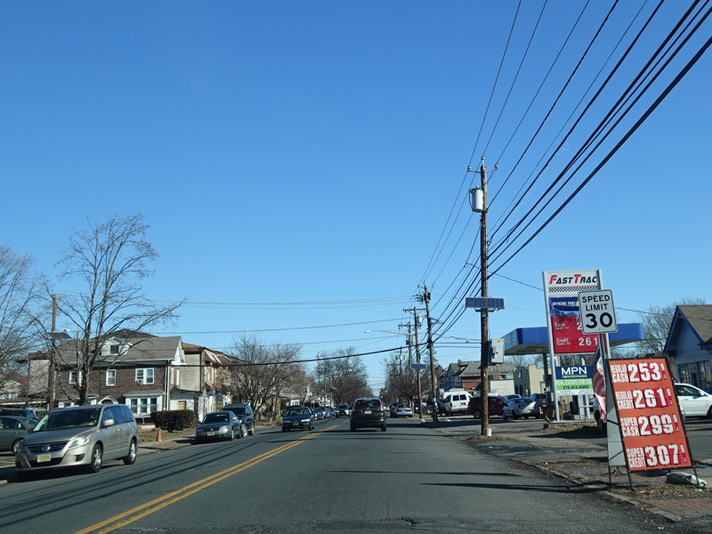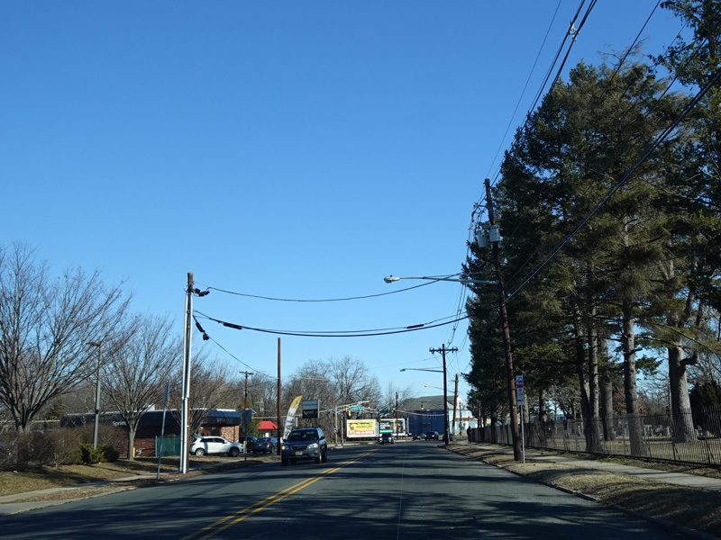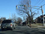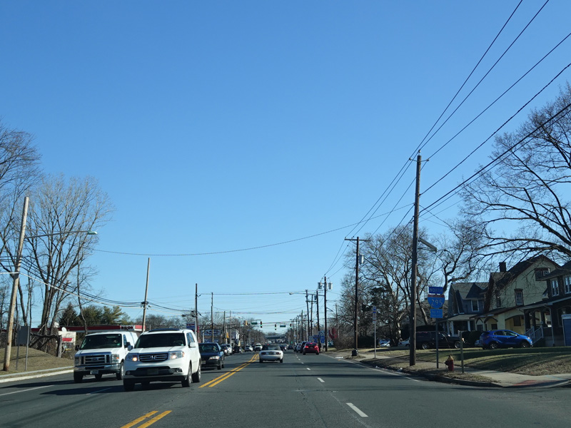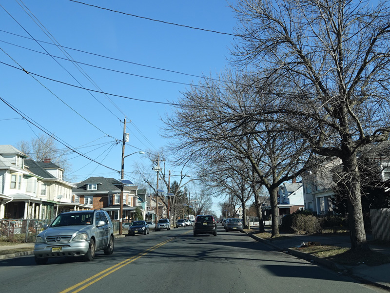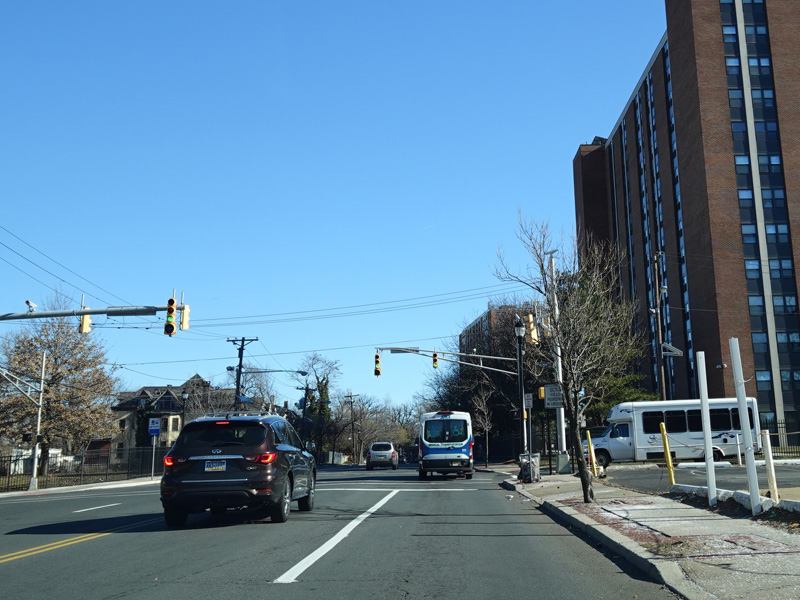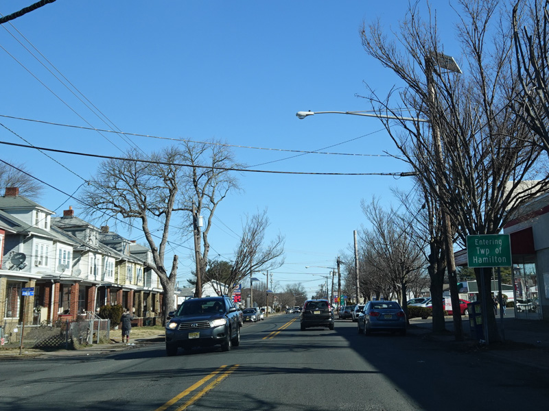 Greenwood Avenue runs east through Trenton as a two-lane undivided road. There are traffic lights at Chestnut Avenue and Monmouth Street.