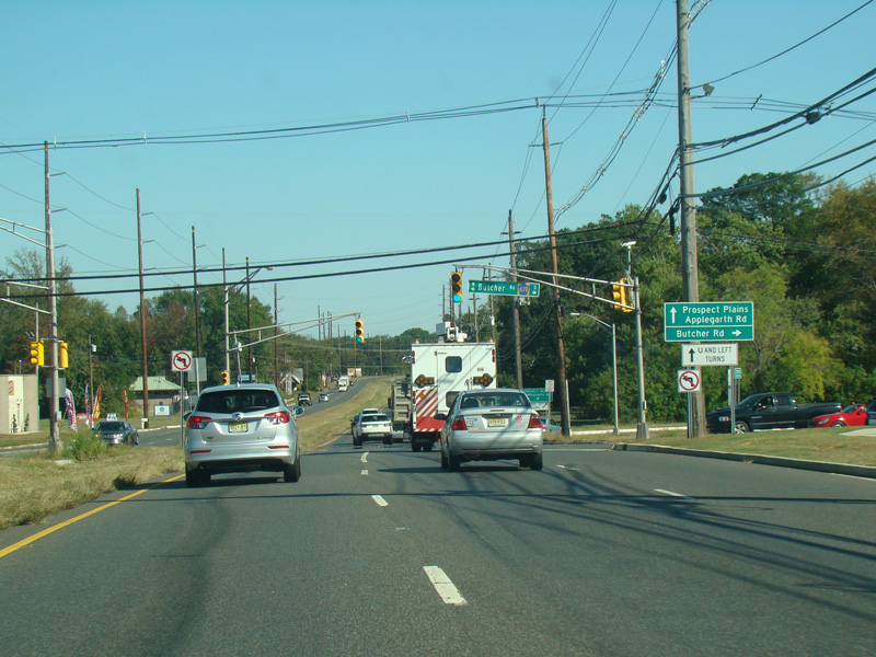 There is a traffic light with jughandles at Butcher Road (CR 619) and Applegarth Road (CR 619).