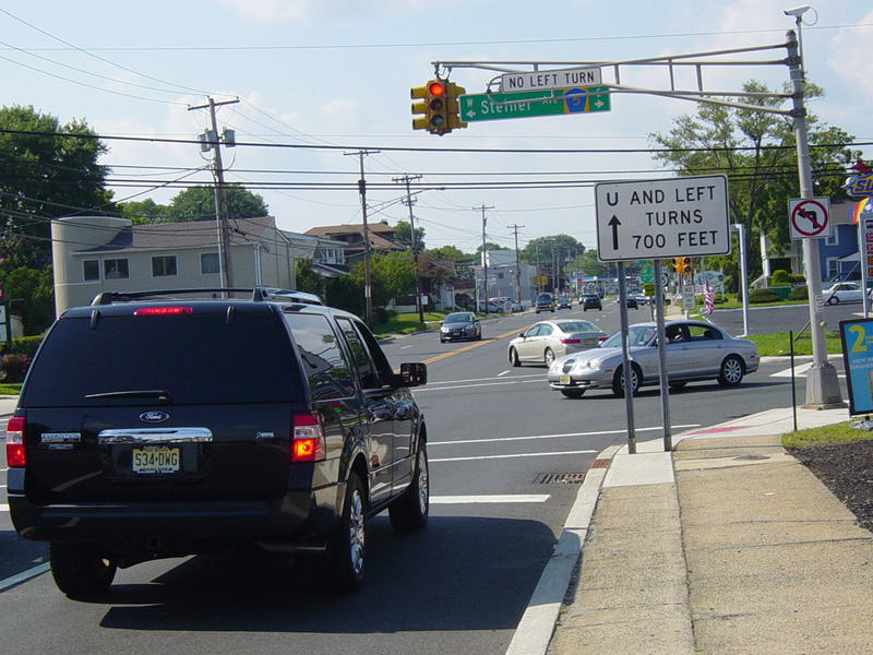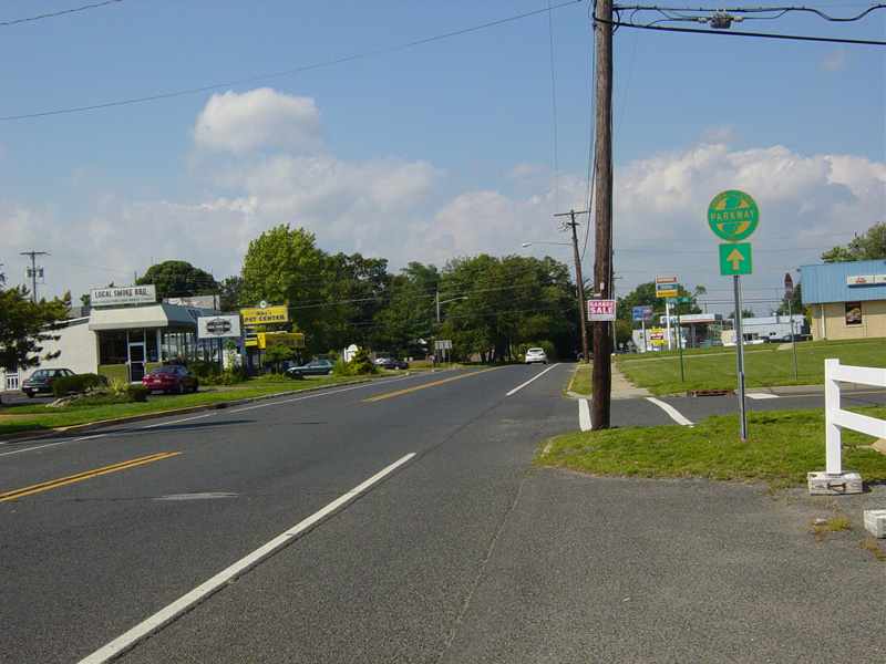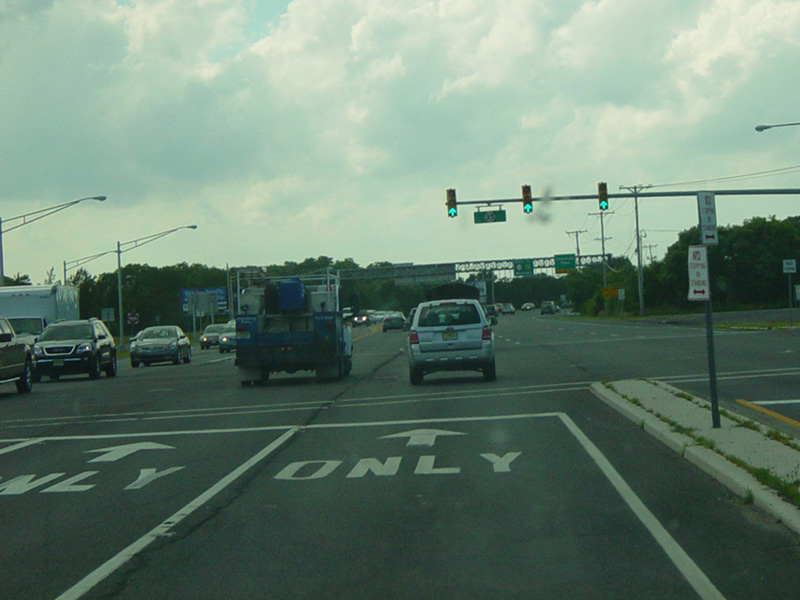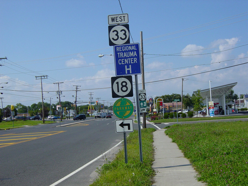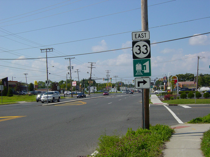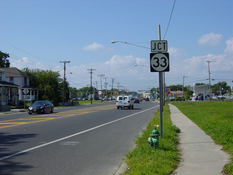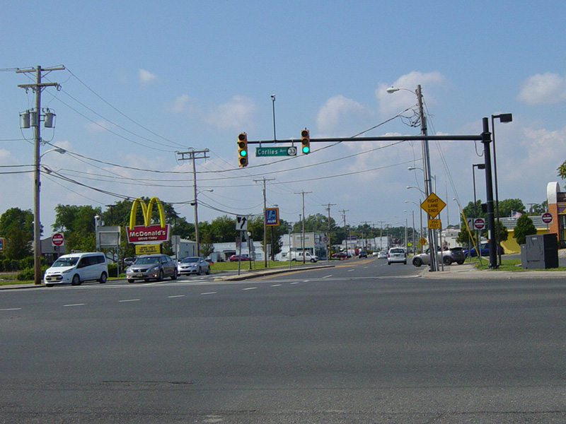 The road widens to four lanes. There is a traffic light at Corlies Avenue (NJ 33). Turn right to go east or left to go west.