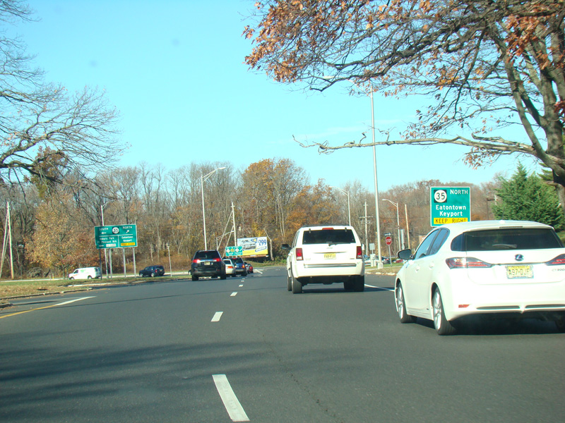 The roadway splits. Bear left for West Sylvania Avenue (CR 15), which runs northwest to Corlies Avenue (NJ 33). Bear right to stay on NJ 35.