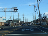 The northbound and southbound lanes come back together, and there is railroad crossing.