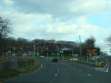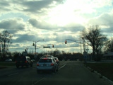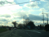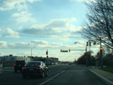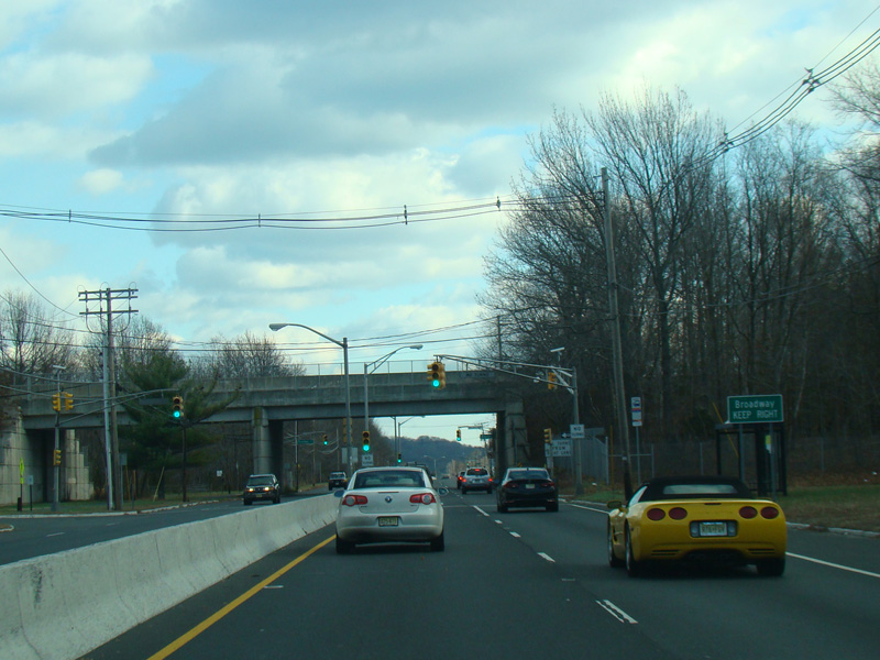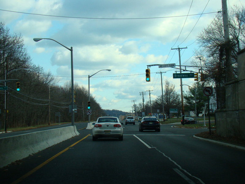 There is a railroad underpass, immediately followed by a traffic light with jughandles at Broadway Avenue.