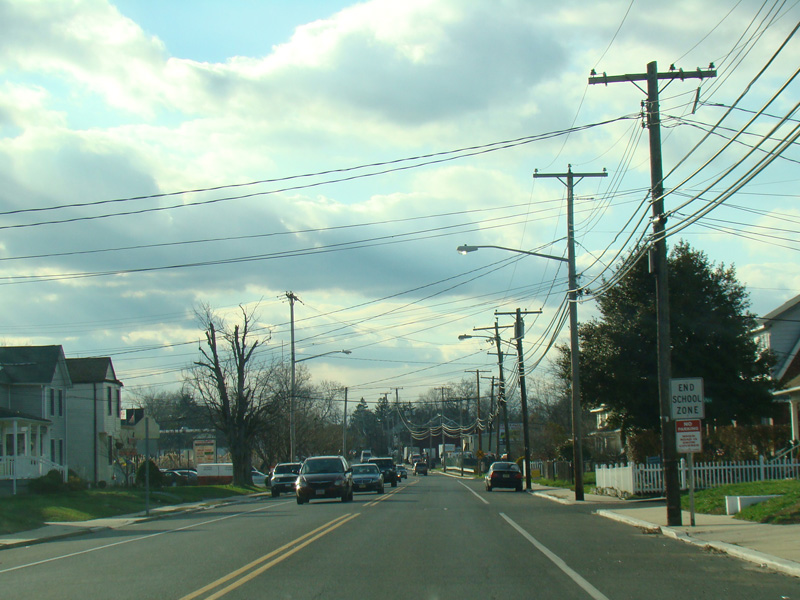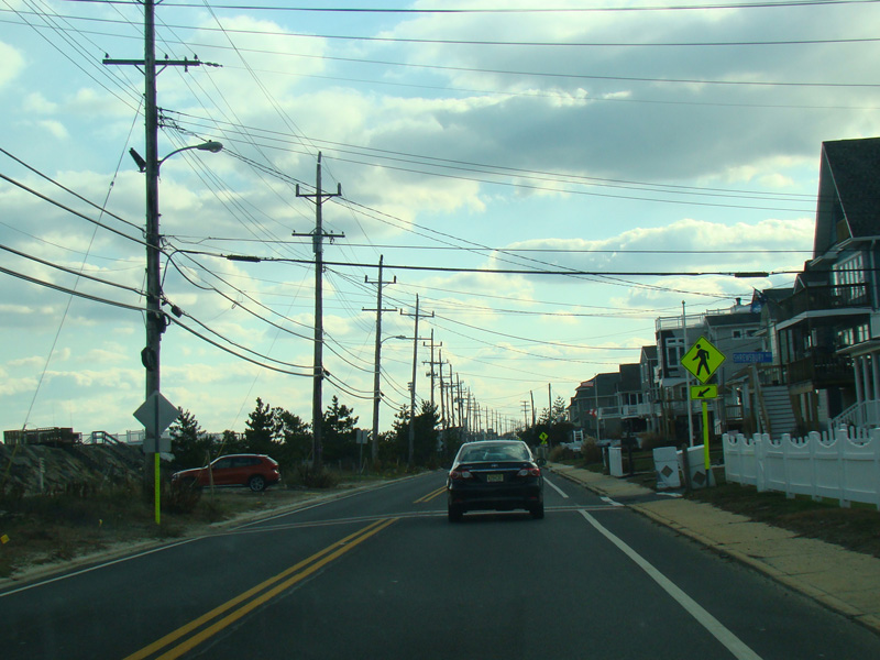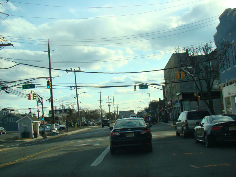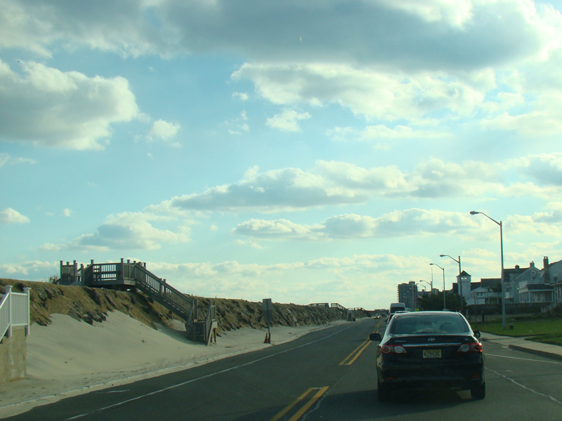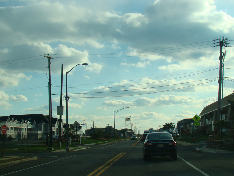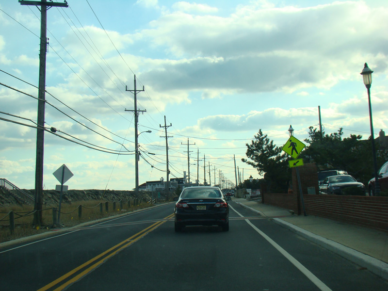 Welcome to Sea Bright! Here, NJ 36 is known as Ocean Avenue. It runs south along a narrow strip of land between the Shrewsbury River and the Atlantic Ocean. There are no major cross streets here, but there are a lot of crosswalks providing access to the beach on the left. There is nowhere to park around here for those who don't live in the area, making this a de facto private beach.