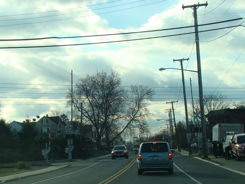 There is a railroad crossing at the North Jersey Coast Line of New Jersey Transit.
