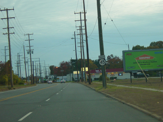 NJ 45 is a north/south route in South Jersey. It begins at NJ 49 in Salem at the point where it changes names from East Broadway to West Broadway and runs north as a two-lane undivided road through Woodstown and Mullica Hill. North of Mullica Hill, it curves to the northwest and widens to become a four-lane divided road, crossing the New Jersey Turnpike (NJ 700) with no interchange. North of the turnpike, it narrows to two lanes in Woodbury and then widens to four lanes again, this time undivided. There is a partial interchange with I-295, and then NJ 45 merges into US 130.