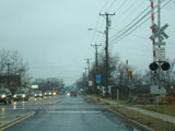 There is a railroad crossing, followed by a traffic light at Railroad Avenue (CR 626).