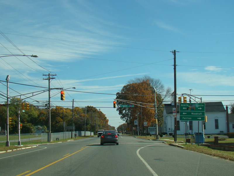 There is a traffic light at Gouldtown-Woodruff Road (CR 553). Turn left to go north or right to go south.