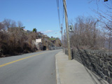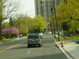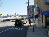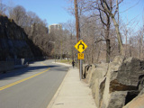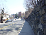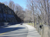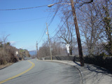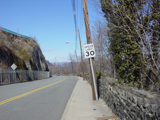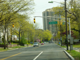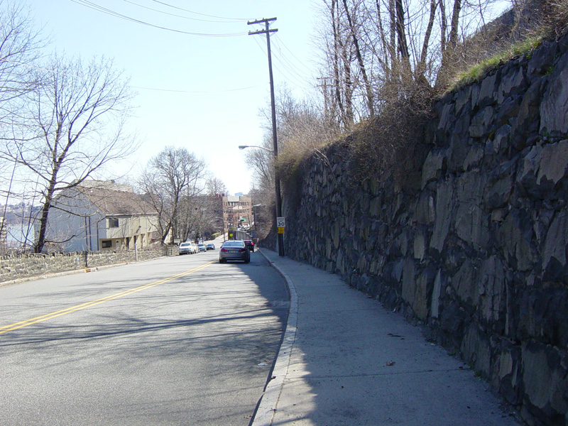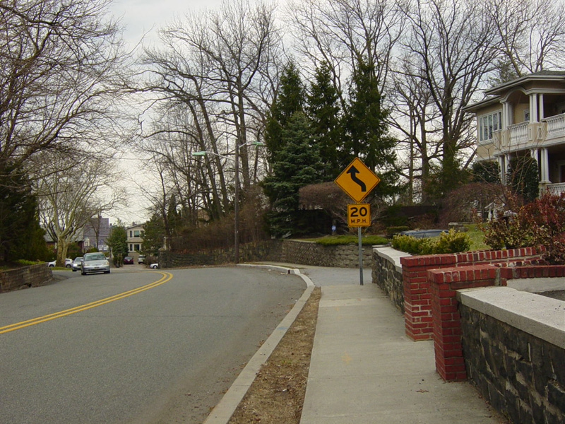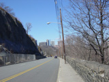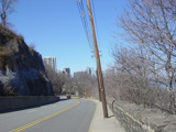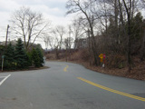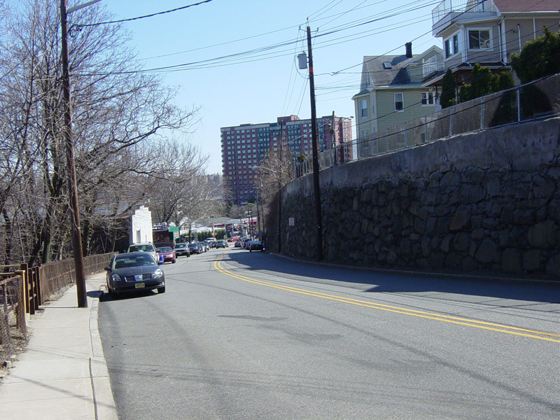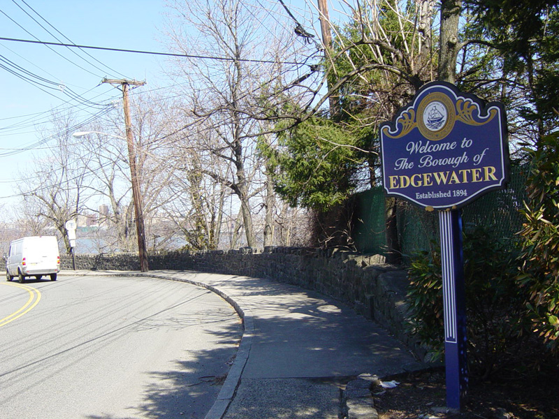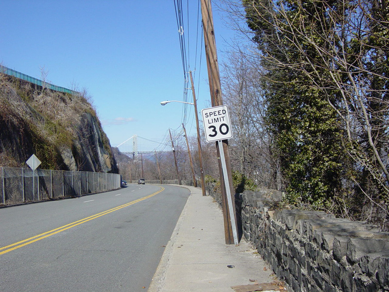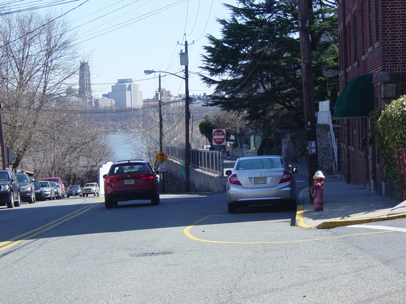 Welcome to Edgewater! NJ 5 descends a steep cliff that separates the waterfront along the Hudson River from the rest of New Jersey. Since the cliff is too steep to go directly to the east here, NJ 5 descends it through a switchback, curving to the north and gradually heading down. The George Washington Bridge (I-95/US 1/US 9) is visible in the distance.