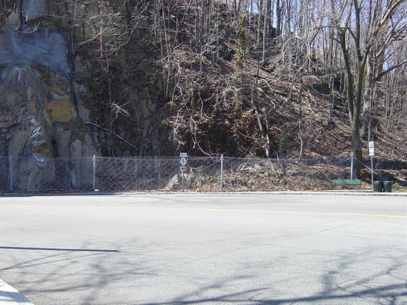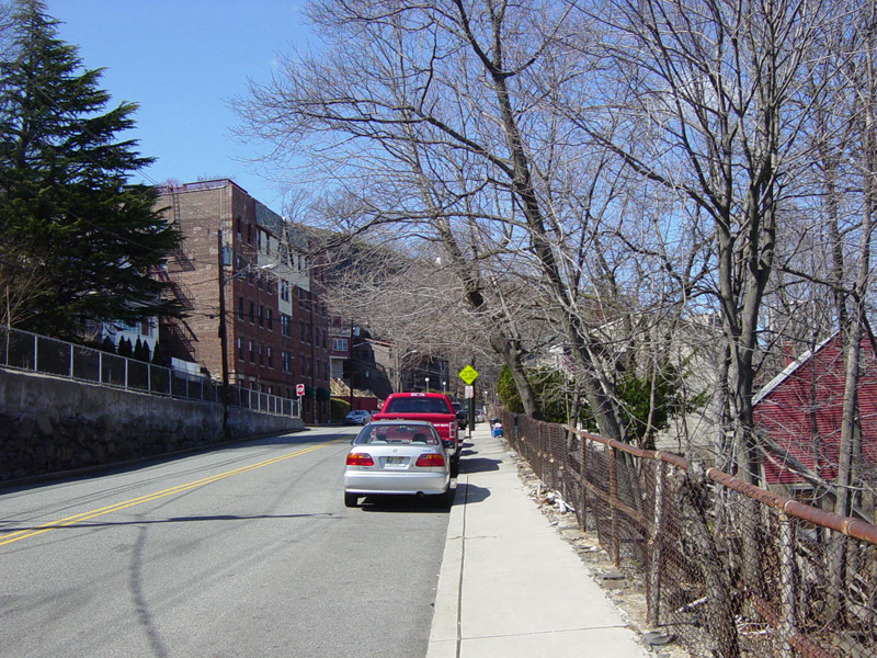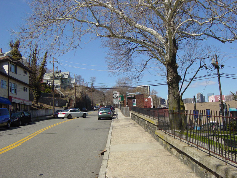 NJ 5 begins at River Road (CR 505) in Edgewater, ascending a steep cliff that separates the waterfront along the Hudson River from the rest of New Jersey. Since the cliff is too steep to go directly to the west here, NJ 5 ascends it through a switchback, first heading north and up.