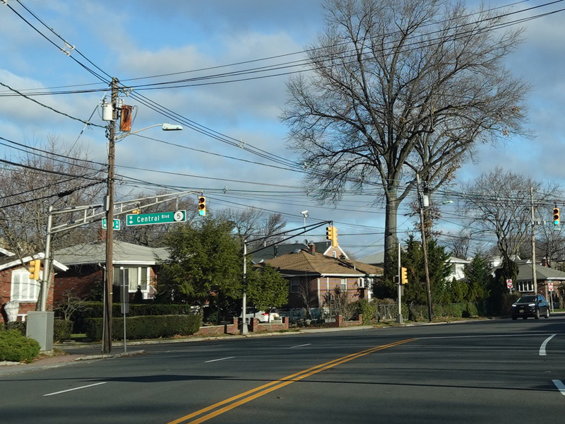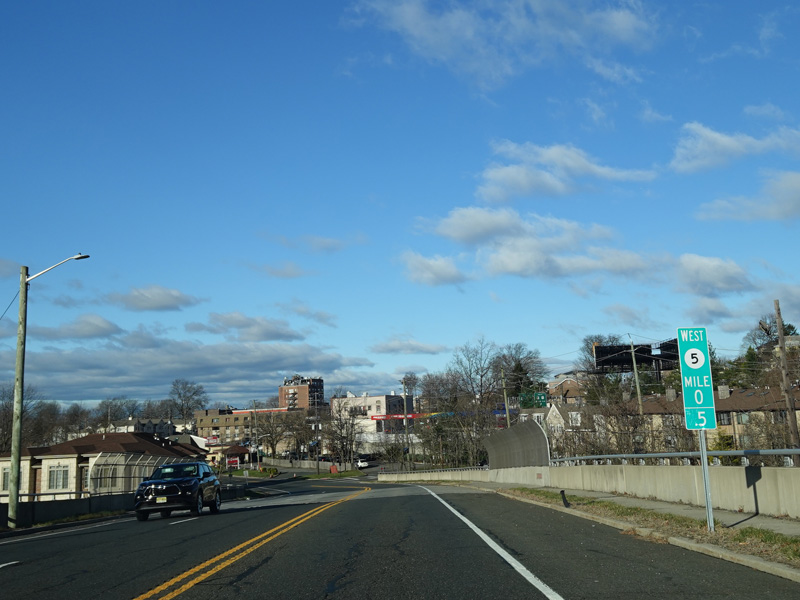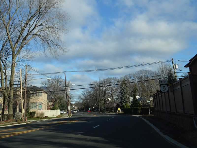 Turn left onto Central Boulevard at this traffic light to stay on NJ 5. Palisade Avenue continues straight ahead as NJ 67. Signage at this intersection could use some improvement. The only signage for NJ 5 is the small green sign on the traffic light pole. There is no signage for NJ 67 except on a mile marker.
