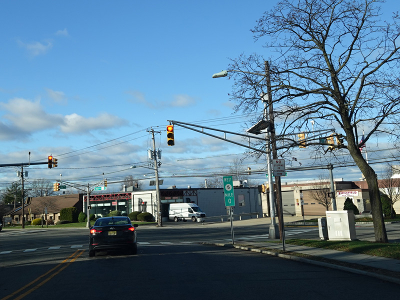 NJ 5 ends at a traffic light at Broad Avenue (US 1/US 9). Turn right to go north or left to go south.