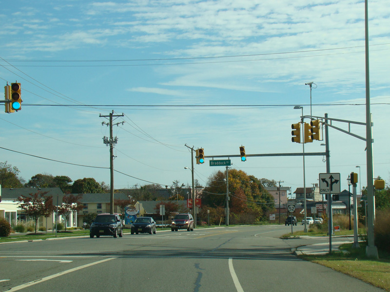 NJ 52 begins at New Road (US 9) in Somers Point. It is known here as MacArthur Boulevard. It starts out as a two-lane divided road, but the median immediately ends. There is a traffic light at Braddock Drive.