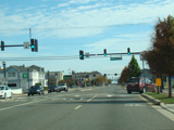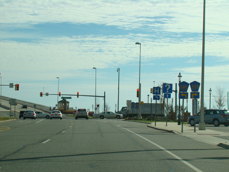 MacArthur Boulevard widens to four lanes, and there is a traffic light. Shore Road (CR 585) begins on the left. Mays Landing Road (CR 559) begins on the right.