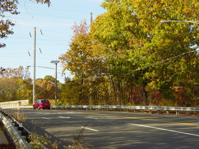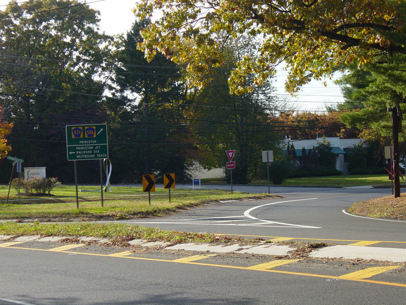 NJ 64 begins at the intersection of Hightstown Road (CR 571/CR 526) with Cranbury Road (CR 615) in West Windsor. There is a bridge over the New Jersey Transit railroad tracks. At the southern end of the bridge, there is a single reassurance shield for CR 571. There is no mention of either NJ 64 or CR 526 in the signage.