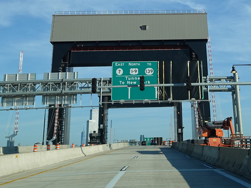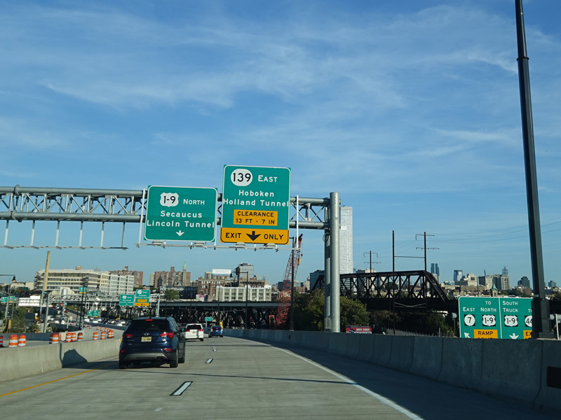 The roadway splits as NJ 7 ends on the other side of the bridge. Use the left lane to go north on Tonnele Avenue (US 1/US 9). Bear right for NJ 139 east toward the Holland Tunnel (I-78).