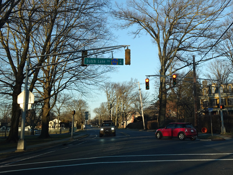 Dutch Lane Road (CR 46) begins on the right at a traffic light.