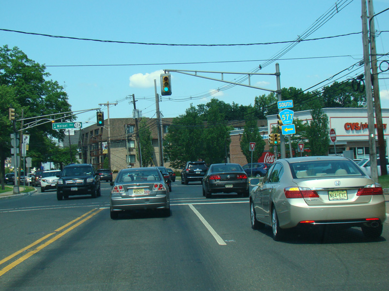 NJ 82 ends here at NJ 124. Take either the first right onto Maple Avenue or the second left onto Meisel Avenue to go east. Continue straight ahead on Morris Avenue to go west. CR 577 is multiplexed with NJ 124 at this intersection. Take the first right to go north or the second left to go south.