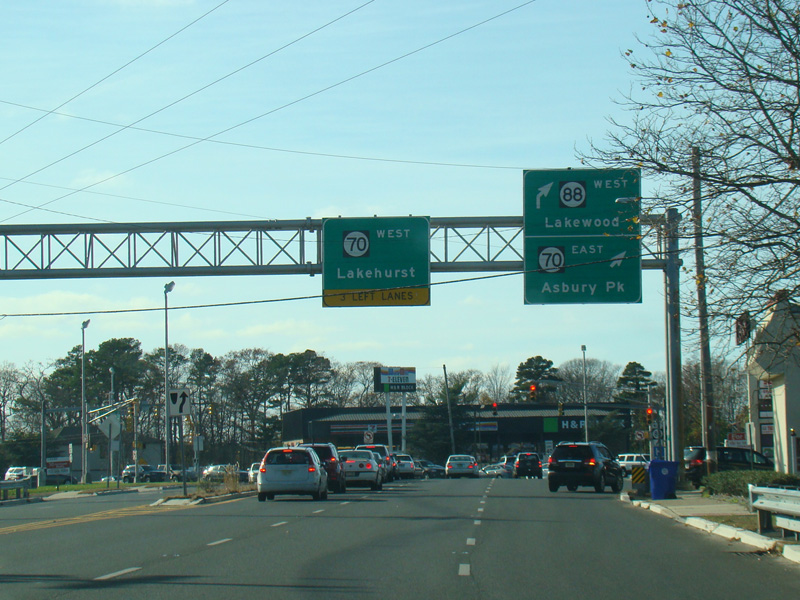 There is a five-way intersection at NJ 70. Bear left to stay on NJ 88. Make a hard left to go east on NJ 70. Continue straight ahead to go west.