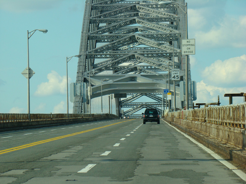 These pictures show the Bayonne Bridge as it appeared before construction work began to raise the roadway so that tall ships could pass under the bridge. The original roadway was undivided and had no shoulder.